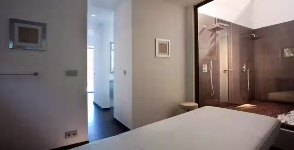 Chambre 1 : La chambre principale climatisée est située au niveau supérieur à côté du salon dans un bâtiment séparé. La suite principale a un lit queen size, deux dressings, ventilateur, WIFI, coffre-fort, télévision HD, un espace de massage et une salle de bains avec double vasque, baignoire encastrée, et une douche extérieure privée à côté du jacuzzi chauffé.